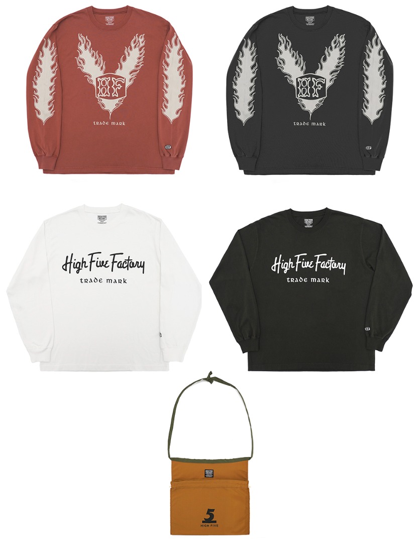 ディレクター山下健二郎が手書きで描き下ろしたフレイムグラフィックを落とし込んだLS TEEや、ブランドロゴを筆記体で表現したHFFらしいLS TEE、さらにエプロンとしてもショルダーバッグとしても使える2WAY仕様のドローストリングバッグが登場。